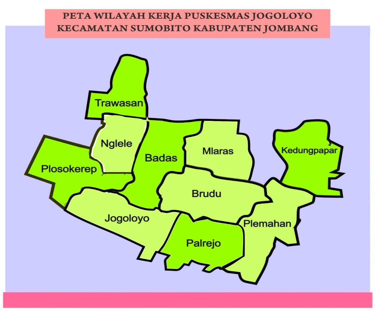 Secara administrasi, wilayah kerja Puskesmas Jogoloyo meliputi 10 desa yaitu Desa Plosokerep, Desa Jogoloyo, desa Palrejo, desa Plemahan, desa Brudu, desa Badas, Desa Nglele, Desa Trawasan, Desa Mlaras dan Desa Kedungpapar. Dengan jumlah Dusun 37 dusun. Desa yang paling banyak dusunnya adalah Desa Palrejo dan Desa Plemahan 5 Dusun.